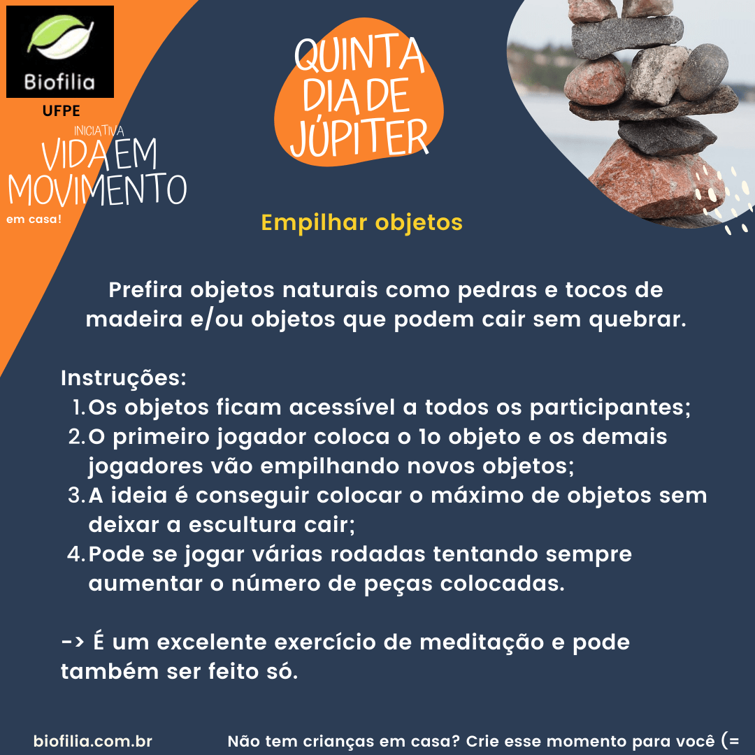 Para lhe ajudar neste desafio, desde o dia 12 de abril/20 nós estamos enviando brincadeiras diárias. Além de divertir e unir toda a família, são brincadeiras que sempre nos ajudam a aprimorar uma nova habilidade. Para receber as brincadeiras diariamente ou adquirir o livro com todas as brincadeiras, cadastre-se em biofilia.com.br.